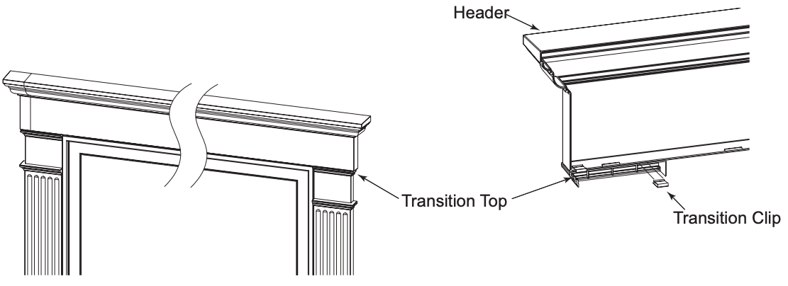 Place the Transition Top pieces on the Header in the approximate locations of the Pilasters. If the Header has the optional Endcaps welded on, use a utility knife to trim the bottom of the Endcaps so that the Transition Top pieces are flush. See figure at left. Clip them to the header using the clips provided. Use two clips per Transition Top. See figure below.